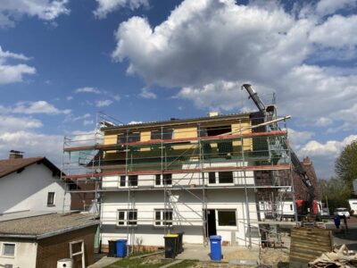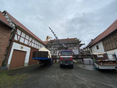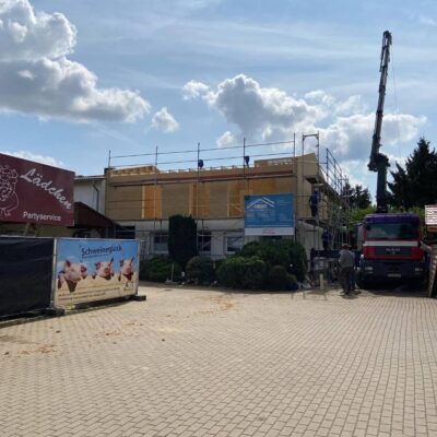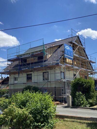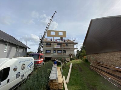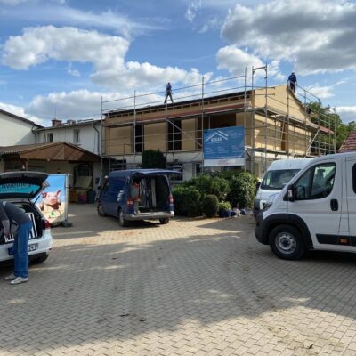 Die Zimmerleute beginnen mit dem Bau der Gauben, indem sie die benötigten Hölzer zuschneiden und zusammenfügen. Die Gauben werden dann am Dach befestigt und mit Dämmmaterial versehen. Im Anschluss erfolgt die Erweiterung des Dachgeschosses um weitere Wände und Fenster.