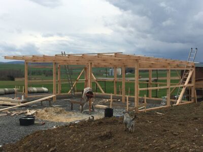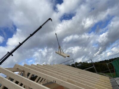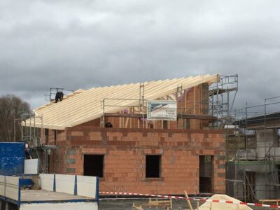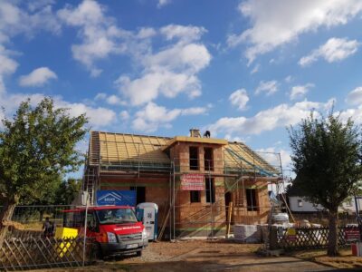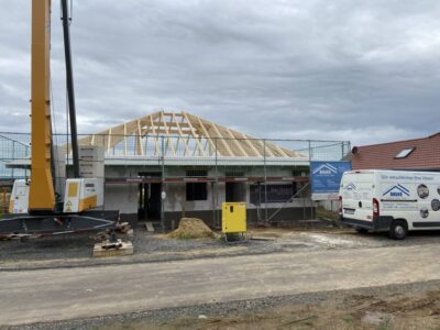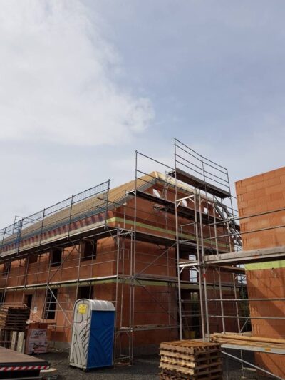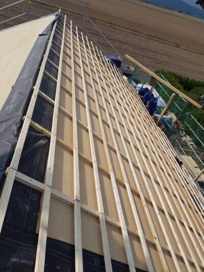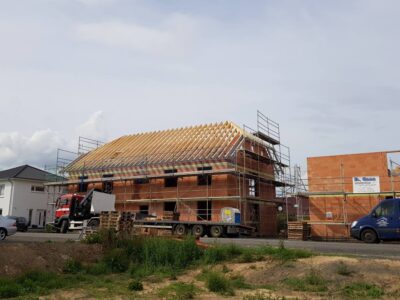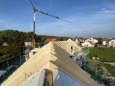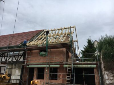 Im Anschluss wird der Dachstuhl vor Ort gefertigt. Dazu werden die Hölzer entsprechend zugeschnitten und mit Zapfen und Schlitzverbindungen zusammengefügt. Eine sorgfältige Verarbeitung ist hierbei essentiell, um eine stabile und langlebige Konstruktion zu erzielen.